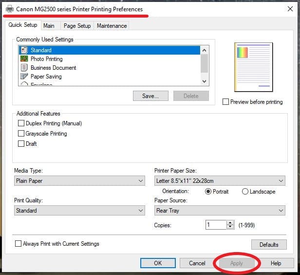 Here you will find several default settings for your Canon printer, which you will alter according to the documents you’re trying to print. If the settings don’t match the dimensions or type of paper you’re trying to print out, you may get an error code.