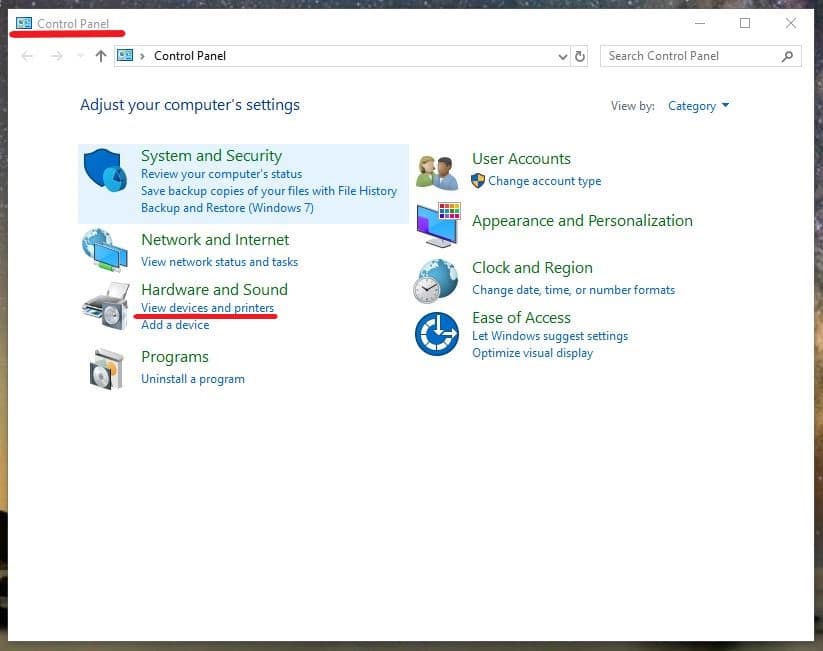 - Locate Devices and Printers in Control Panel: After you hit “OK,” a large box will open up with several menu items. Locate “Hardware and Sound.” Underneath it, click on “View devices and printers.”