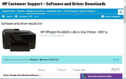 Note that the HP support site will automatically detect your operating system, and provide you with the correct software. If you want to change the selection, simply click on the “Change” link on the site.