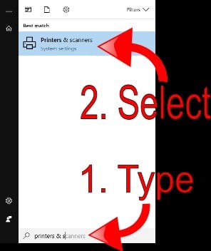1. Hit the Windows Key and type Printers & Scanners in the search box, and then select the top result: